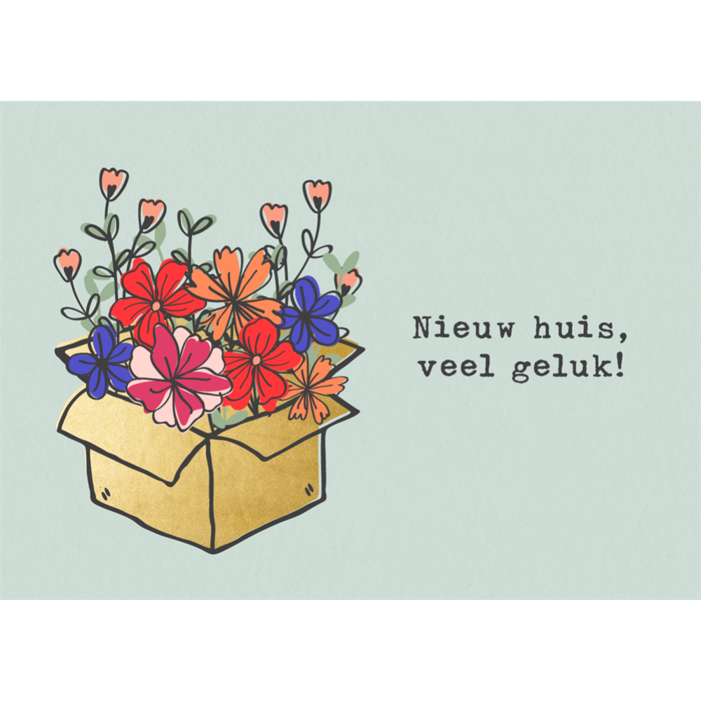 Wenskaart met bloemen en de tekst nieuw huis veel geluk