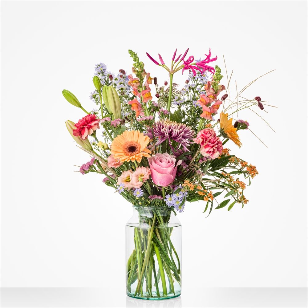 Laat je betoveren door de prachtige kleuren van dit luxueuze boeket. Met de mooiste seizoensbloemen creëren we een warme en levendige mix die je hart zal veroveren. Geef een onvergetelijk geschenk met dit betoverende boeket, perfect om een glimlach te toveren. Levering in heel Nederland.