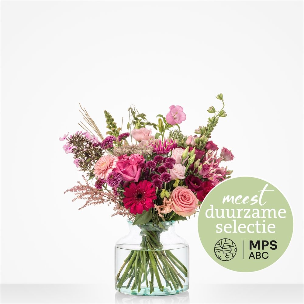 Laat je liefde bloeien met Groen Gekeurd Hartelijk, een weelderig boeket in roze en rood. Vol duurzame bloemen, perfect voor elke gelegenheid. Ontdek onze Groen Gekeurd-collectie: stijlvol, luxe en met zorg samengesteld. Maak iemand blij met een tastbaar gebaar van liefde en waardering, geleverd door heel Nederland.