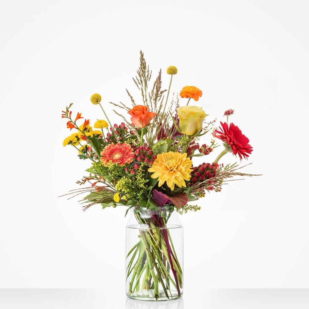 Ervaar de schoonheid van het herfstseizoen met dit prachtige boeket vol seizoensbloemen. Een blikvanger die je niet mag missen! Het Herfsttint boeket is een speels arrangement in de warme kleuren van de herfst. Maak je geschenk compleet met onze bijpassende vaas, verrukkelijke chocolaatjes of luxueuze bonbons voor een ultieme verrassing. Houd er rekening mee dat het geleverde boeket kan verschillen van de afbeelding, aangezien bloemen natuurproducten zijn.