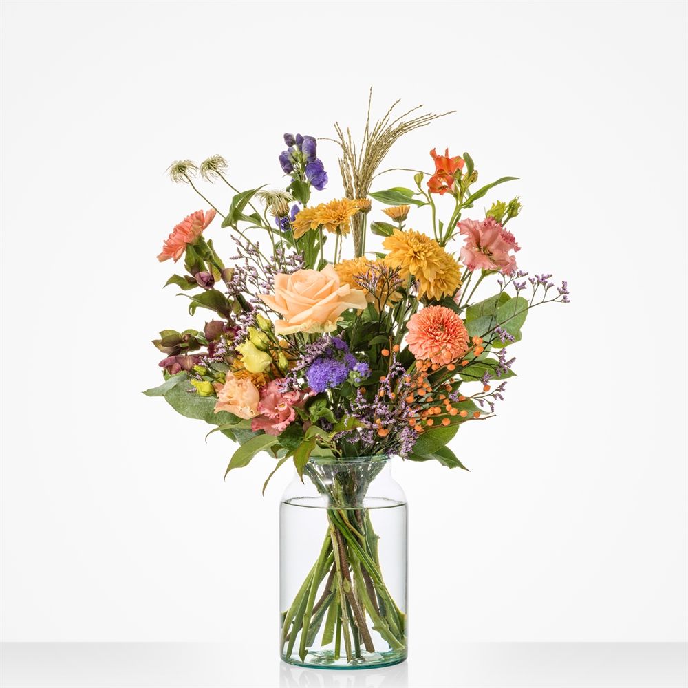 Ontdek onze prachtige mix van paarse, gele, oranje en koraalkleurige bloemen. Een unieke combinatie van winterse tinten die een echte eyecatcher vormen. De kleuren, gecombineerd met de mooiste bloemen van het seizoen, maken Najaarsweelde tot een absolute favoriet. Het ideale boeket om iemand te verwarmen tijdens de koude wintermaanden. Het luchtig gebonden boeket in plukstijl komt perfect tot zijn recht in onze bijpassende Perfect Vintage vaas. Een perfecte match! Maak het extra speciaal met heerlijke chocolade of luxueuze bonbons. Een ultieme verrassing. Houd er rekening mee dat het geleverde boeket kan afwijken van de foto, omdat bloemen natuurproducten zijn.