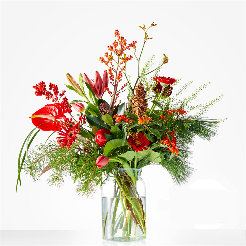 Dit vrolijke rode plukboeket is hét perfect cadeau om het echte kerstgevoel te bezorgen. Voeg een leuke fotokaart met persoonlijke kerstwens toe en de verrassing is compleet. (excl.vaas) Het geleverde boeket wijkt af van de foto aangezien bloemen natuurproducten zijn.