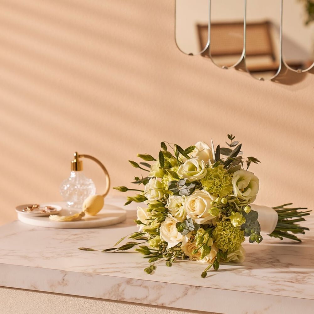 Maak jouw bruiloft onvergetelijk met dit witte, klassieke bruidsboeket. Elegantie in de meest pure vorm. Dit rondgebonden boeket bevat tijdloze bloemen in diverse wittinten. Een romantisch boeket geschikt voor elke type bruiloft dankzij de combinatie van klassieke vormen en moderne accenten. Het perfecte trouwboeket om jullie dag nog mooier en specialer te maken. Goed om te weten: Bestel jouw trouwbloemen minimaal zeven dagen voor de gewenste leverdatum om de bloemist de tijd te geven jouw bruidsboeket tot in perfectie samen te stellen.