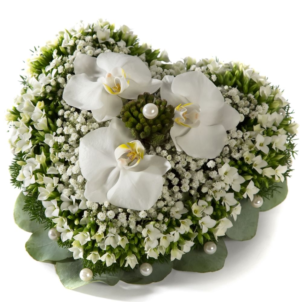 Hartje kunstig opgemaakt met kalanchoëbloemetjes, orchidee en gipskruid, incl. ondergrond, excl. lint