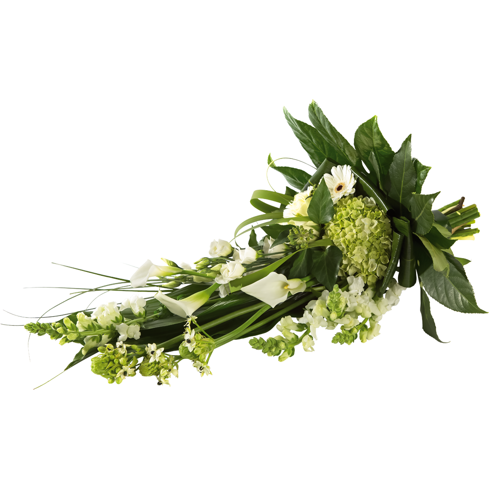 Stijlvol wit rouwboeket dat liggend wordt gepresenteerd, excl. ondergrond, vaas en lint.