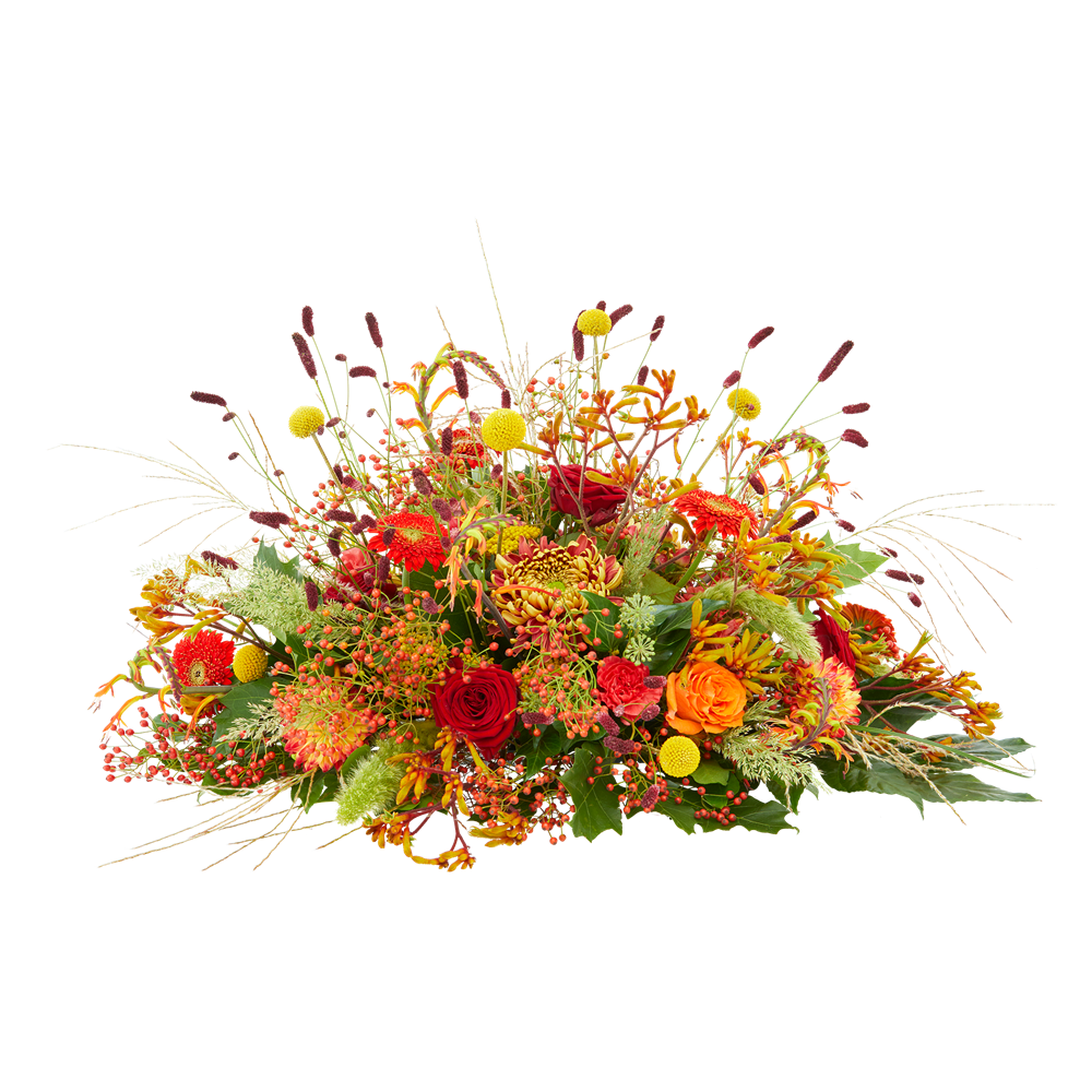 Het ovale bloemstuk Avondzon - Warm Gebaar | Rouwstuk Het ovale bloemstuk Avondzon is een luchtig en modern rouwstuk binnen het thema Warm Gebaar met warme kleuren. De subtiele exotische en tropische touch maakt dit bloemstuk tot een prachtige keuze voor een mooi en waardig afscheid. Dit rouwstuk bestaat uit bloemen die van de laatste warme dagen tot de eerste koude dagen veelvuldig voorkomen, waaronder bessen, grassen, dahlia's en mooie hortensia's. Avondzon is verkrijgbaar in de maten 60 cm (klein), 80 cm (middel) of 100 cm (groot). Bij bestelling van rouwbloemen wordt elk stuk persoonlijk en handmatig gecontroleerd om te garanderen dat het voldoet aan jouw wensen. Levering van het rouwstuk kan plaatsvinden op een locatie naar keuze, zoals een kerk, rouwcentrum of crematorium. Je hoeft het rouwstuk niet zelf op te halen, de bloemist zorgt ervoor dat het rouwboeket op het juiste moment wordt bezorgd, waardoor de bloemen op hun mooist zijn. Een geruststellende gedachte in een moeilijke tijd.