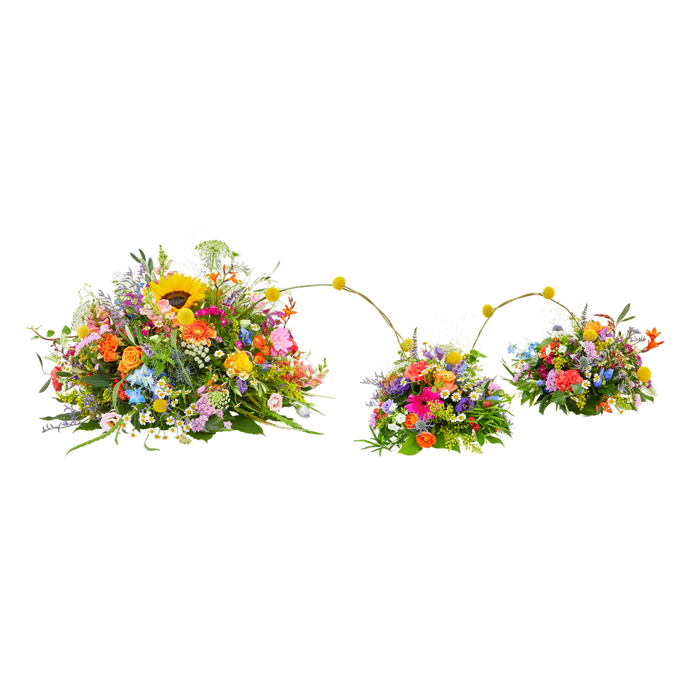 Het bontgekleurde bloemstuk Eeuwige Verbinding: een eigentijdse en kleurrijke keuze voor rouwgelegenheden. Bestaande uit één groot rond bloemstuk (50cm) en twee kleinere ronde stukken (30cm), kan dit stuk worden uitgebreid met één of twee extra kleine bloemstukken. Met zijn opvallende vorm en krachtige kleuren is dit rouwarrangement echt uniek. De bloemen die je hierin vindt, zijn voornamelijk typisch voor de warmere seizoenen. Bij ons wordt elke bestelling van rouwbloemen zorgvuldig gecontroleerd door onze klantenservice, waardoor we garanderen dat het bloemstuk volledig naar wens wordt samengesteld. Onze ervaren bloemisten bezorgen de rouwbloemen op de gewenste locatie, of dat nu bij een kerk, een rouwcentrum of een crematorium is. Geen gedoe met het ophalen bij de bloemist, wij zorgen ervoor dat het rouwstuk stipt op tijd wordt bezorgd, zodat de bloemen op hun mooist zijn. Een geruststellende gedachte in moeilijke tijden.