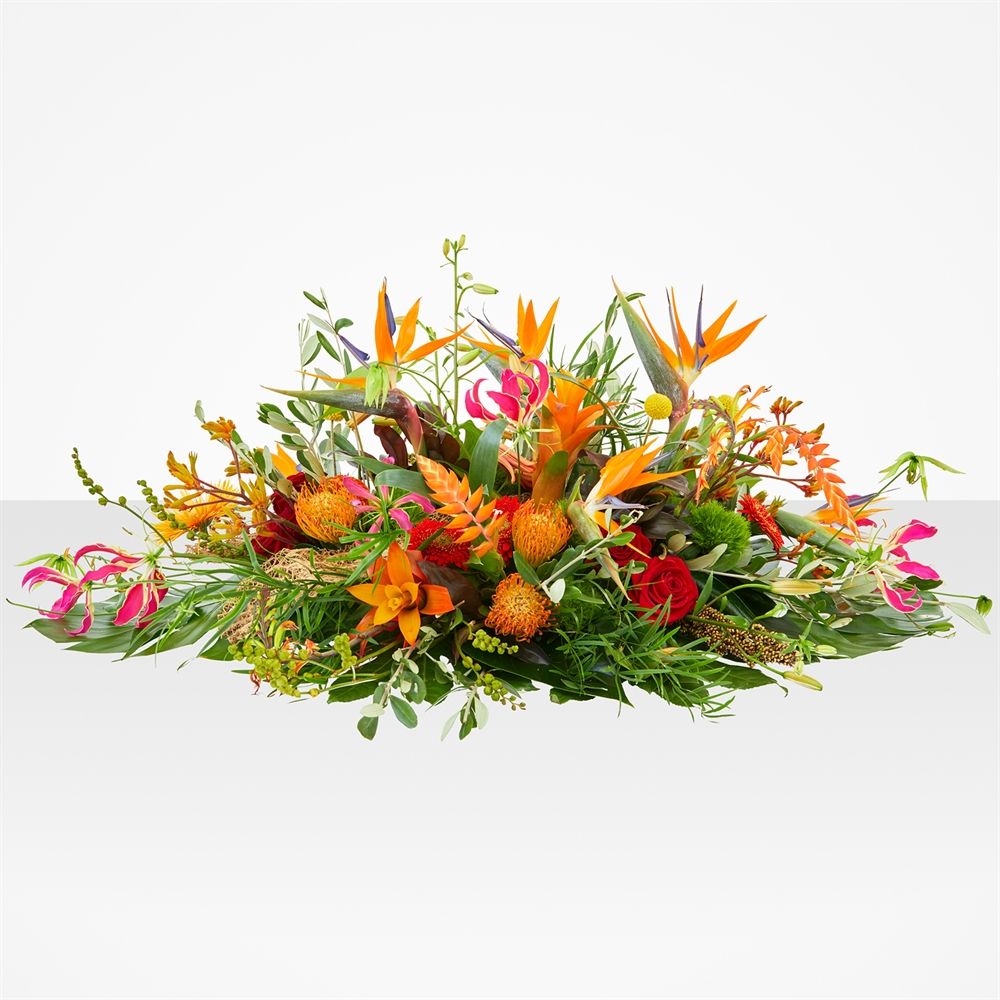 Duik in onze wereld van elegantie en luxe met het betoverende ovale bloemstuk "Exotische Tuin". Laat je omringen door de warme kleuren en subtiele exotische flair, perfect voor een uniek en persoonlijk afscheid. Laat dit stijlvolle rouwstuk een cadeau van liefde en troost zijn, bezorgd door heel Nederland. Ervaar de magie van bloemen geven en emoties delen.