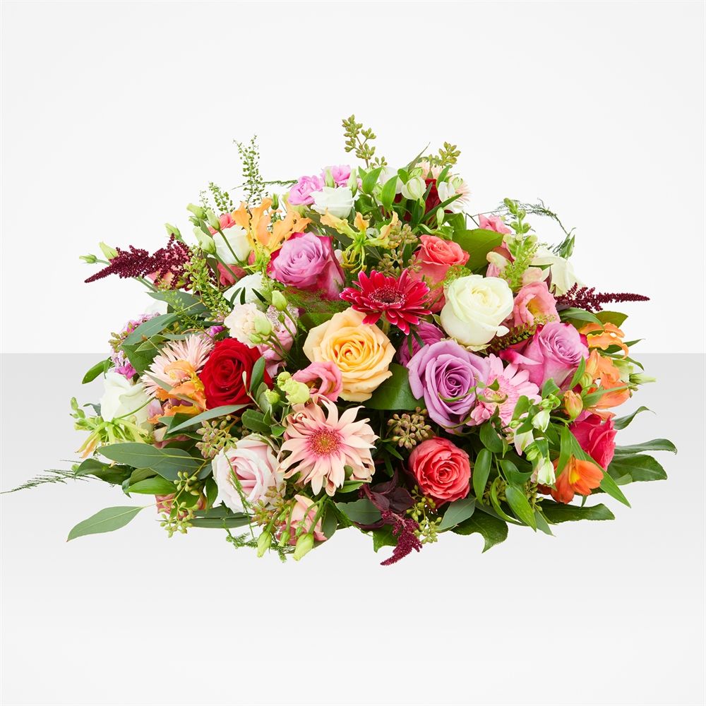 Het stijlvolle rouwstuk Laatste kus met warme rozen is een eerbetoon vol kleur. Met zorg samengesteld in elegante Biedermeier-stijl. Geef bloemen als betekenisvol geschenk en laat ze door heel Nederland bezorgen voor een onvergetelijke ervaring.