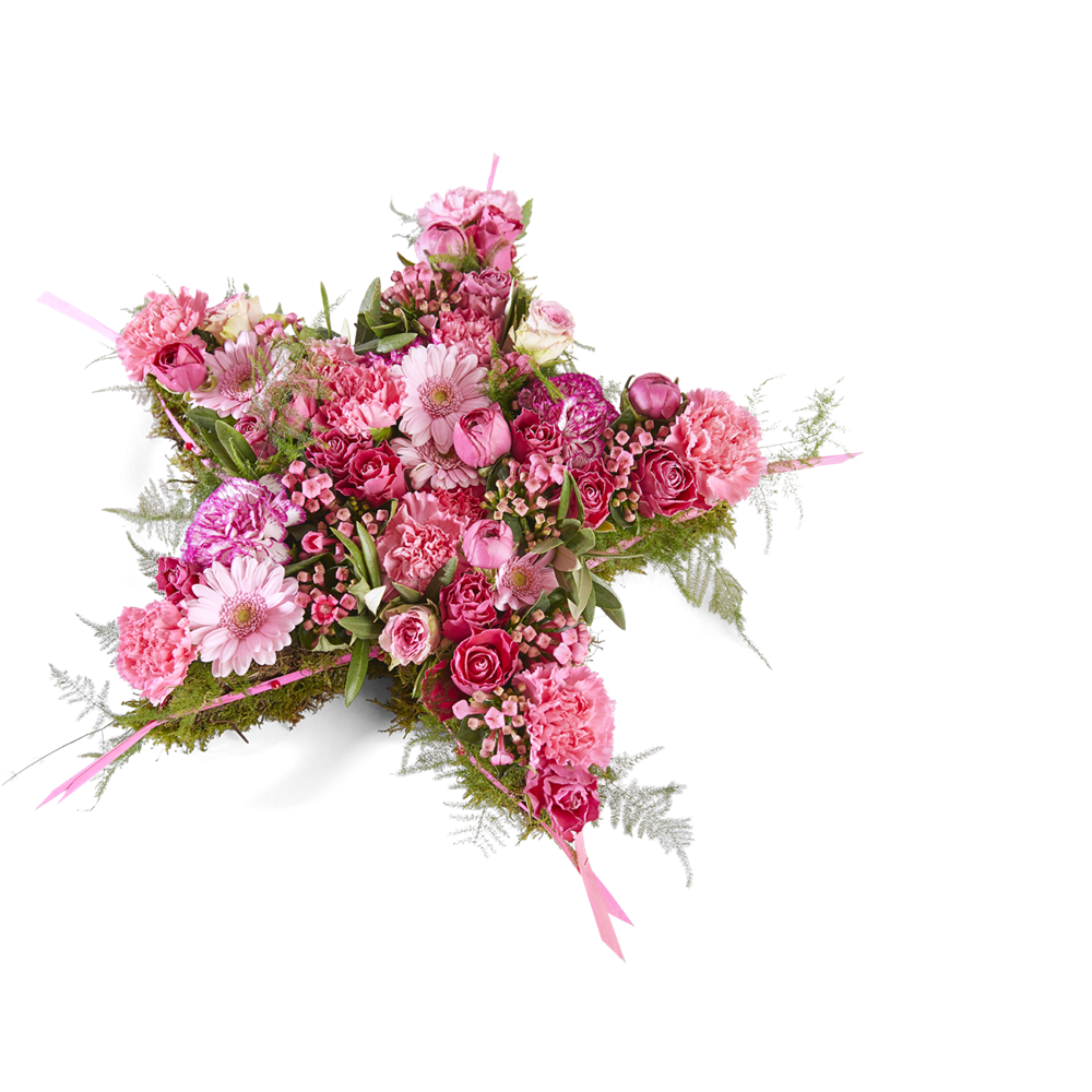 Het rouwstuk 'Mooiste ster' - liefdevol bloemstuk in ster-vorm | Fleurop Ontdek het rouwstuk 'Mooiste ster', een prachtig bloemstuk in de vorm van een ster met warm getinte bloemen. Verkrijgbaar in 35cm (klein), 45cm (middel) of 55cm (groot) - passend bij jouw wensen. Dit rouwstuk behoort tot het thema 'Onze sterren' in onze rouwwerken. Onze sterren verdienen het om gezien te worden en voor eeuwig te stralen. Binnen dit thema vind je betekenisvolle, speciale vormen. Belangrijk om te weten: elke bestelling met rouwwerk wordt zorgvuldig gecontroleerd door onze klantenservice, om ervoor te zorgen dat het rouwstuk perfect wordt samengesteld volgens jouw wensen. Onze deskundige bloemisten leveren de rouwbloemen op elke gewenste locatie - bij een kerk, rouwcentrum of crematorium. Je hoeft het rouwstuk niet zelf op te halen, wij zorgen dat het rouwboeket op het juiste moment wordt bezorgd en in volle bloei is. Een geruststellende gedachte in moeilijke tijden.