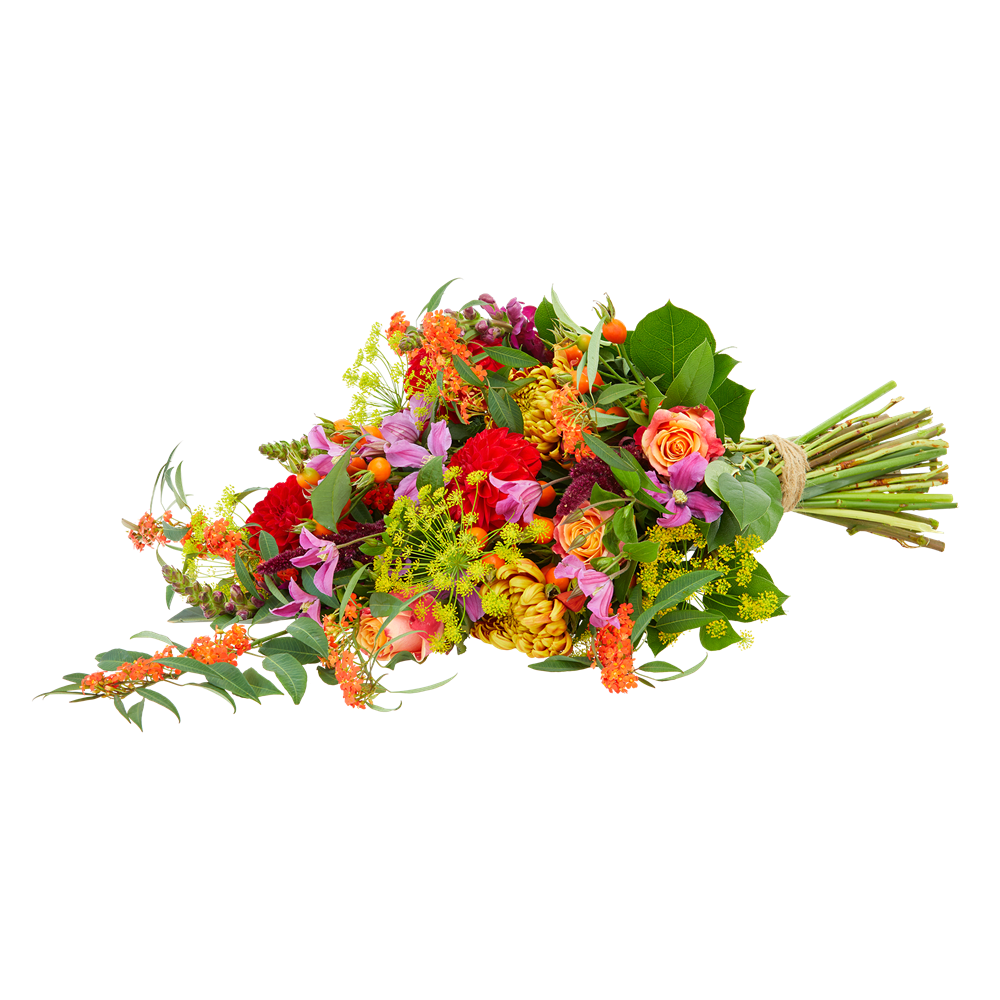 Ontdek het Najaarsgloed rouwboeket: een compact, eigentijds arrangement met de prachtigste bloemen van het seizoen. Een waardig gebaar voor een persoonlijk afscheid. Dit boeket wordt zonder vaas geleverd. Wist je dat elke rouwbestelling zorgvuldig met de hand wordt gecontroleerd? Op die manier verzekeren we dat het rouwstuk geheel naar wens wordt samengesteld. De rouwbloemen worden bezorgd op een locatie naar keuze, zoals een kerk, rouwcentrum of crematorium. Het ophalen bij de bloemist is niet nodig, de bezorging wordt door hen op het juiste moment geregeld, zodat de bloemen op hun mooist zijn. Een geruststellende gedachte in een moeilijke tijd.