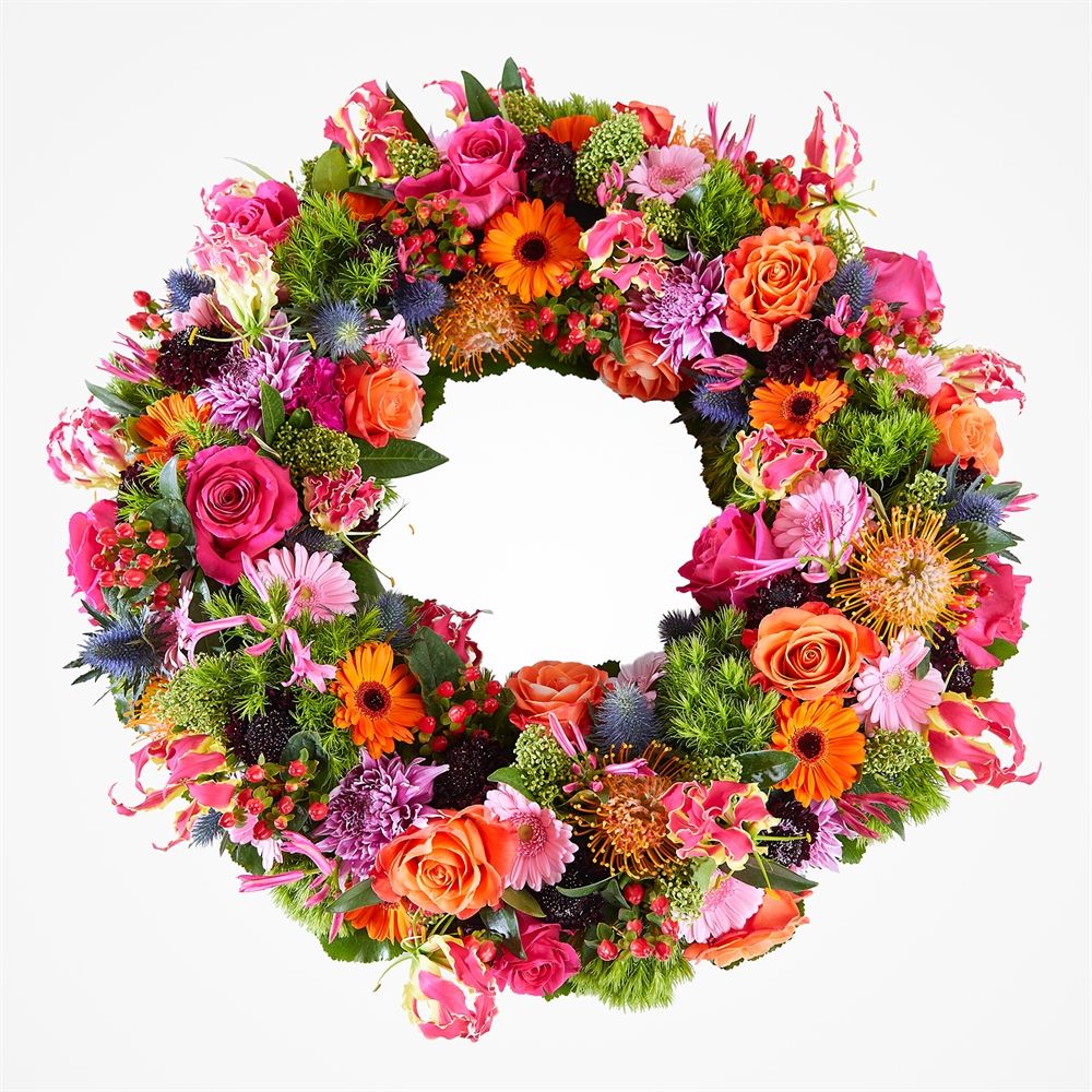 Vier de rijkdom van de seizoenen met onze rouwkrans Oneindige Kleuren. Een warme, exotische creatie van bloemen als bessen, grassen, dahlia’s en hortensia's. Breng troost en schoonheid bij een afscheid. Wij leveren in heel Nederland.