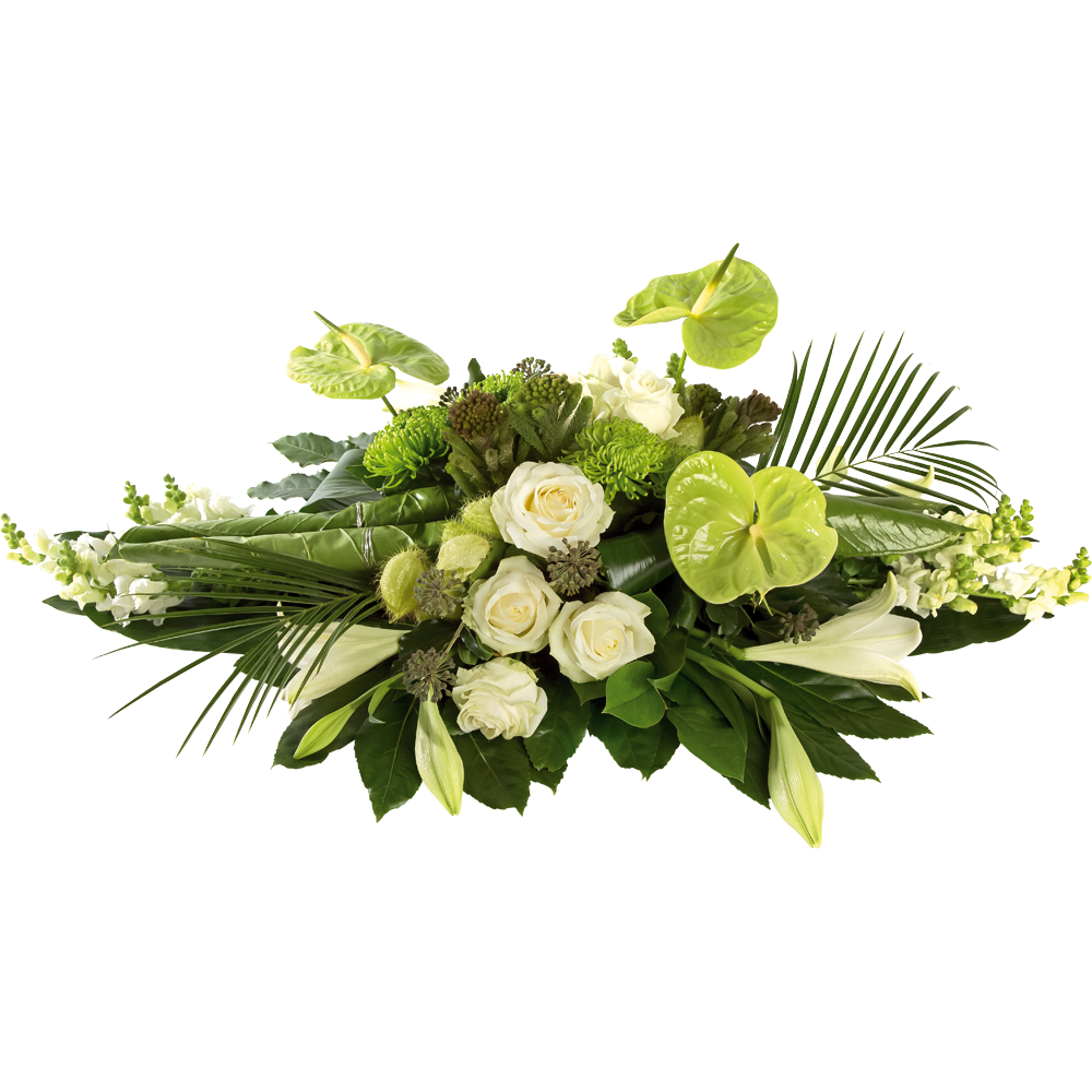 Modern gemengd rouwarrangement met witte roos, anthurium en chrysant. Excl. Lint.