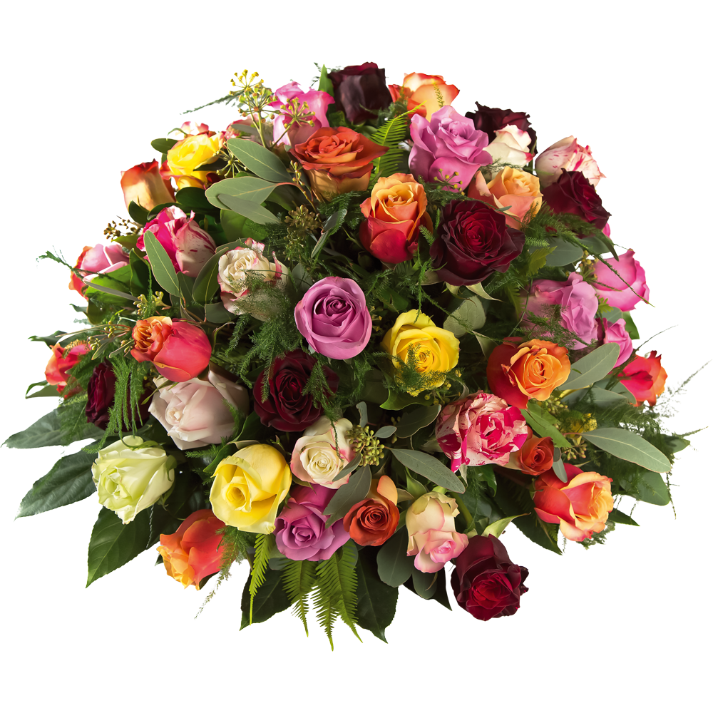 Rozen in diverse kleuren vormen deze kleurrijke biedermeier, excl. lint.