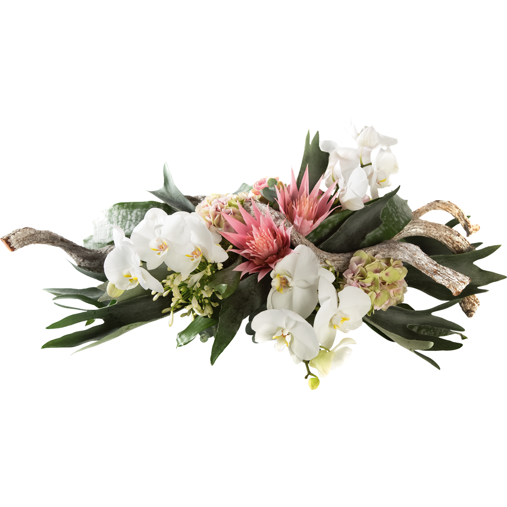 Orchidee gedrapeerd over houtstronken zet de toon bij dit smaakvolle rouwarrangement / rouwstuk. Excl. lint.
