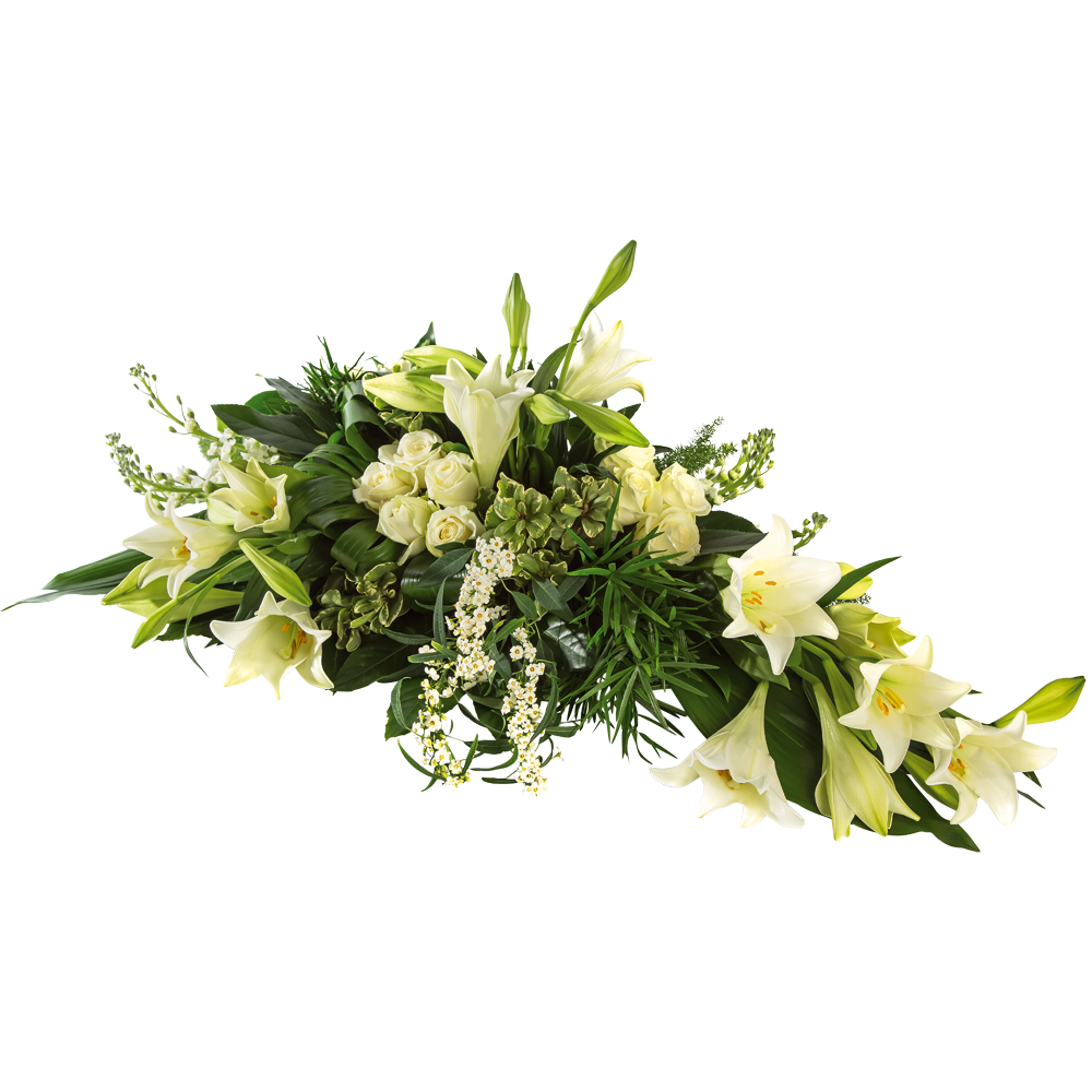 Groen- en wittinten geven een zachte sfeer aan dit stijlvolle rouwarrangement, excl. lint.