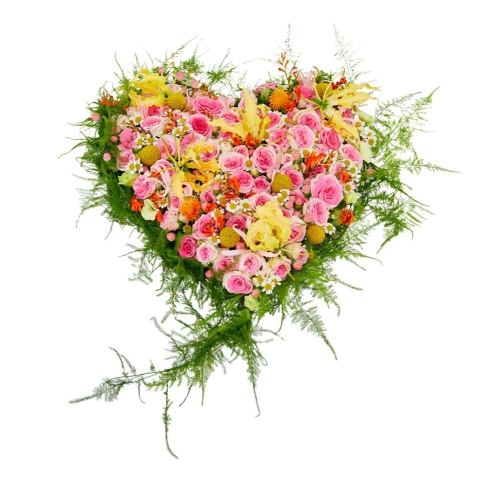 Het kleurrijke rouwstuk Rozengeur in hartvorm met bijzondere rozen in warme kleuren en roze tinten. Verkrijgbaar in 35cm, 45cm of 60cm. Onze klantenservice controleert elke bestelling met rouwwerk persoonlijk en handmatig. Bezorging mogelijk bij verschillende locaties. Laat onze bloemisten voor een tijdige bezorging en maximale versheid zorgen. Een troostrijk gebaar in moeilijke tijden.