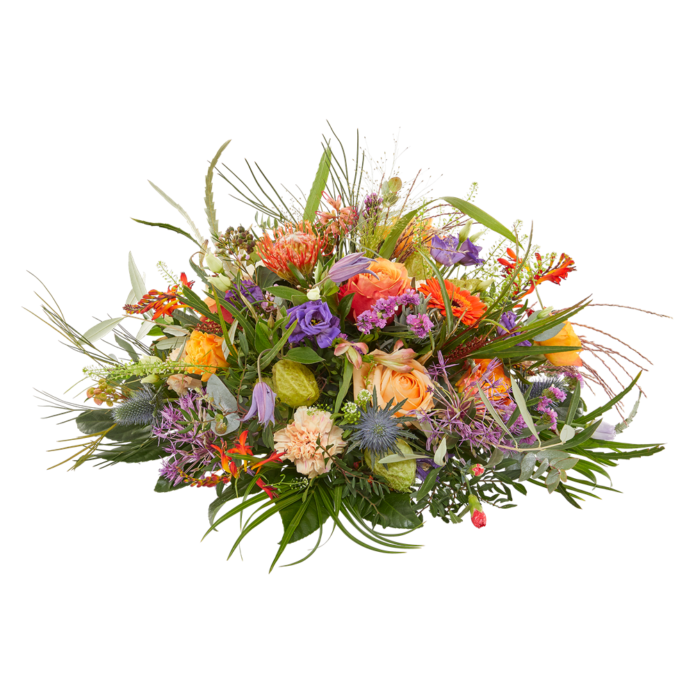 Het ronde Biedermeier rouwstuk 'Speelse warmte' is een modern en kleurrijk bloemstuk met warme tinten, behorend tot het thema 'Warm gebaar'. Door de subtiele exotische en tropische accenten is dit bloemstuk een prachtige keuze voor een mooi en respectvol afscheid. De bloemen worden in ronde vorm samengebonden volgens de bekende Biedermeier-stijl, waardoor ze vanuit verschillende hoeken goed zichtbaar zijn. Het rouwarrangement is verkrijgbaar in drie formaten: 40 cm (klein), 50 cm (middel) of 60 cm (groot). Belangrijk om te vermelden is dat elke bestelling met rouwbloemen persoonlijk en handmatig wordt gecontroleerd om te garanderen dat het arrangement perfect wordt samengesteld naar jouw wensen. Naast een levering op locatie van jouw keuze (kerk, rouwcentrum, crematorium), hoef je het rouwstuk niet zelf op te halen bij de bloemist. De bloemist zorgt ervoor dat het rouwboeket op het juiste moment wordt bezorgd, zodat de bloemen op hun mooist zijn tijdens een emotionele periode. Een geruststellende gedachte in moeilijke tijden.