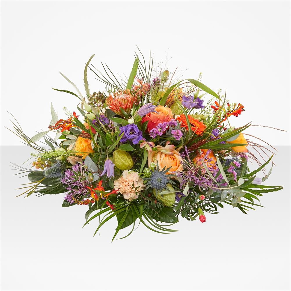 Laat je gevoel spreken met ons stijlvolle rouwstuk Speelse Warmte. Dit kleurrijke meesterwerk uit de Warm gebaar collectie straalt warmte en troost uit. De exotische en tropische accenten geven een bijzondere touch aan dit unieke statement van liefde en herinnering. Laat je geliefden voelen hoe speciaal ze zijn met dit prachtige bloemstuk, een warm gebaar vanuit het hart. Bestel vandaag nog en verras met bloemen vol emotie en betekenis.