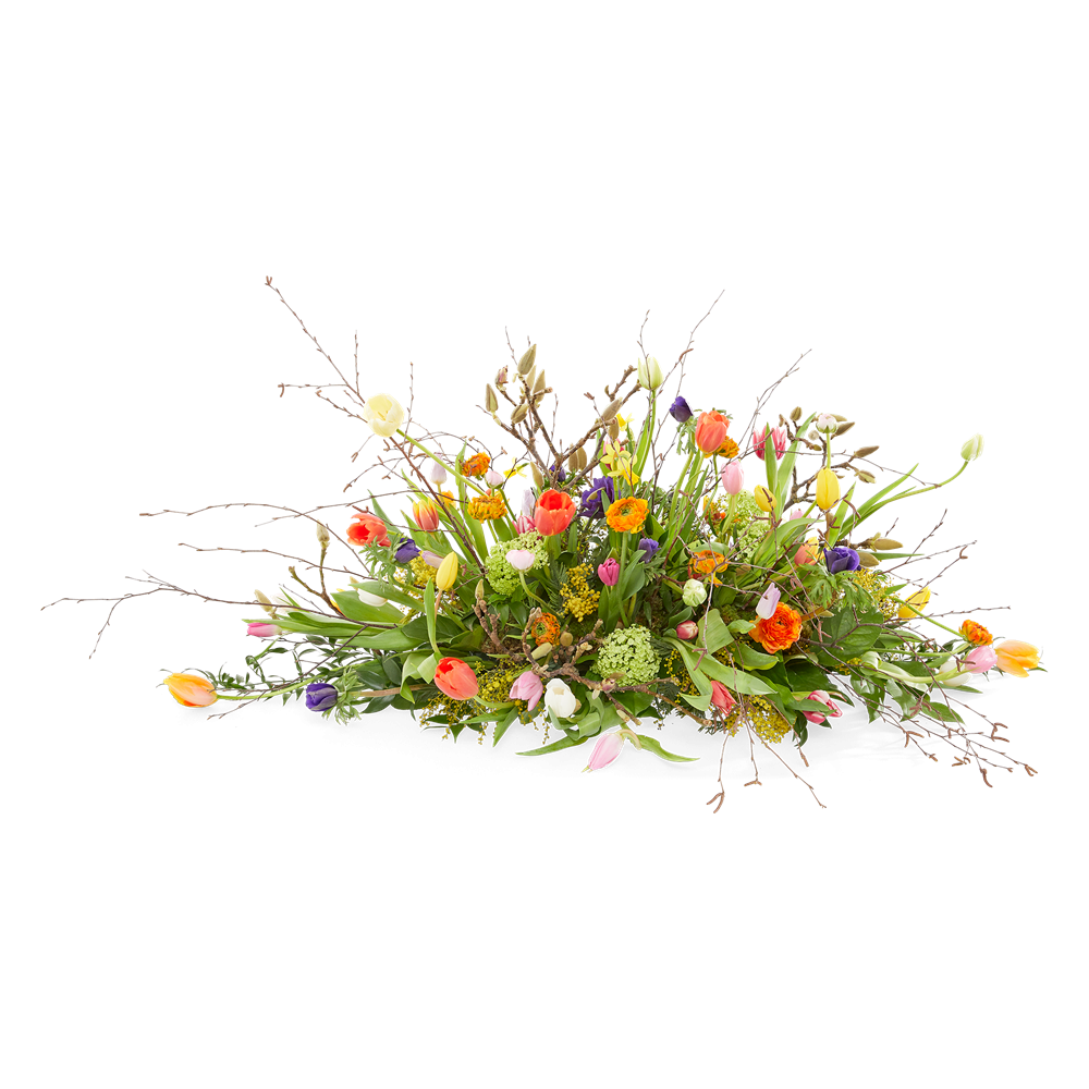 Het ovale rouwstuk 'Uit de bol': kleurrijk, modern en karakteristiek Het ovale rouwstuk 'Uit de bol' is samengesteld met de prachtigste seizoensbloemen, beschikbaar van januari tot april. Dit bontgekleurde rouwstuk met een moderne stijl en een unieke uitstraling is verkrijgbaar in drie formaten: 50cm, 80cm of 100cm. Wist je dat wij elke bestelling met rouwwerk zorgvuldig laten controleren door onze klantenservice medewerkers? Op deze manier garanderen we dat het rouwstuk precies volgens wens wordt bezorgd door onze lokale collega bloemisten. Een extra stukje zekerheid in een moeilijke periode.