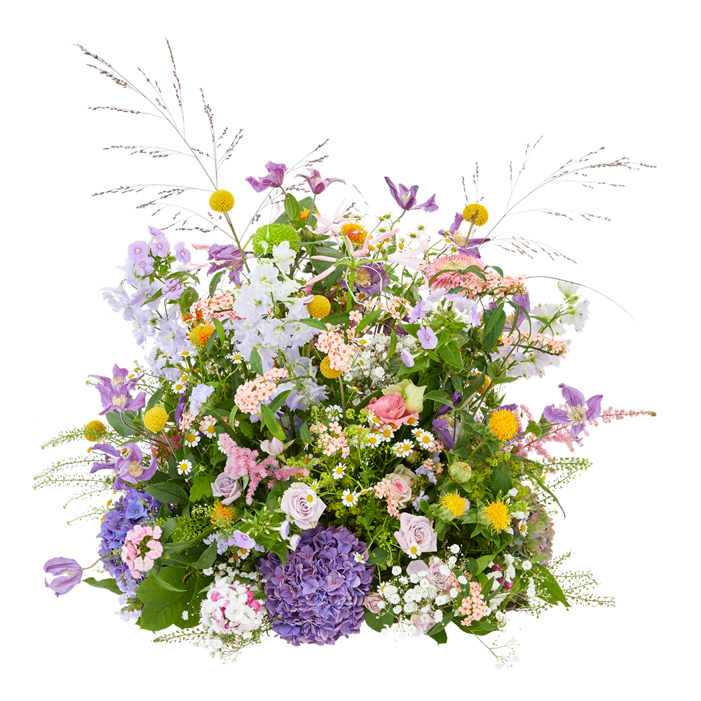 Het ronde bloemstuk Veldmist - Veldachtig, modern en kleurrijk | Rouwbloemen samengesteld met mooiste bloemen van seizoen Het ronde bloemstuk Veldmist is een veldachtig, modern en kleurrijk bloemstuk. Dit biedermeier rouwstuk is samengesteld met de mooiste bloemen van dit seizoen. Een biedermeier bloemstuk of rond rouwstuk is zeer passend voor een mooi, warm en persoonlijk afscheid. Verkrijgbaar in 40cm (klein), 50cm (middel) of 60cm (groot). Fijn om te weten: iedere bestelling met rouwwerk wordt persoonlijk en handmatig gecontroleerd. Hiermee garanderen wij dat het rouwstuk volledig naar wens wordt samengesteld. De rouwbloemen worden bezorgd op een locatie naar keuze (bij een kerk, rouwcentrum of crematorium). Geen noodzaak om het rouwstuk zelf op te halen bij de bloemist, wij zorgen dat het rouwboeket op het juiste moment wordt bezorgd en de bloemen op hun mooist zijn. Een geruststellende gedachte in een verdrietige periode.