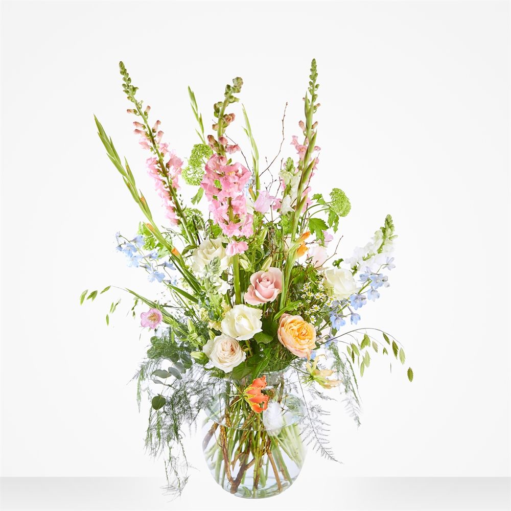 Onze Unieke Veldzicht rouwboeketten vormen een modern en weelderig eerbetoon in zachte pasteltinten. Creëer een liefdevol afscheid met dit prachtige boeket. Laat dit geschenk van bloemen warmte brengen in deze moeilijke tijd. Laat ons je dierbaren steunen met onze levering door heel Nederland. Let op: vaas niet inbegrepen. Geef een tastbaar gebaar van troost en liefde.