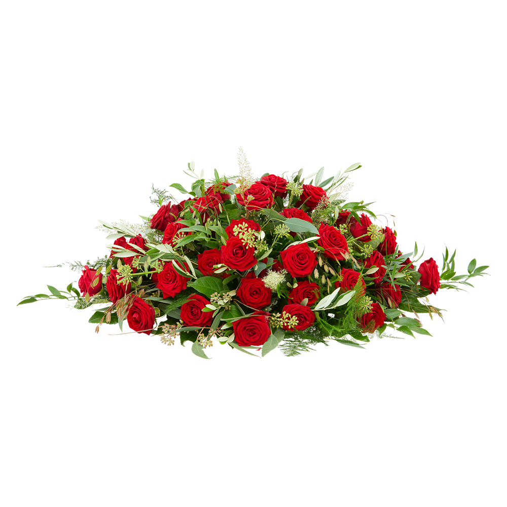 Het ovale rouwstuk 'Voor altijd' - Compact en tijdloos met prachtige rode rozen Het ovale rouwstuk 'Voor altijd' is een tijdloos bloemstuk met de mooiste rode rozen. Dit klassiek-moderne bloemarrangement is zorgvuldig samengesteld, zodat de bloemen zowel compact als luchtig, perfect tot hun recht komen. Dit rouwstuk is verkrijgbaar in drie maten: 60cm (klein), 80cm (middel) en 100cm (groot). Elke bestelling met rouwwerk wordt persoonlijk gecontroleerd en met de hand samengesteld om ervoor te zorgen dat het rouwstuk volledig aan je wensen voldoet. De rouwbloemen kunnen bezorgd worden op elke gewenste locatie, zoals een kerk, rouwcentrum of crematorium. Je hoeft het rouwstuk niet zelf op te halen, de bloemist zorgt voor een tijdige bezorging en dat de bloemen prachtig tot hun recht komen. Dit biedt een geruststellende gedachte in een verdrietige periode.