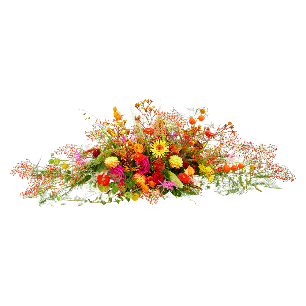De Warme bes kistbedekking is een luchtig en modern bloemstuk in warme kleuren, verkrijgbaar in 140 cm, 160 cm of 200 cm.