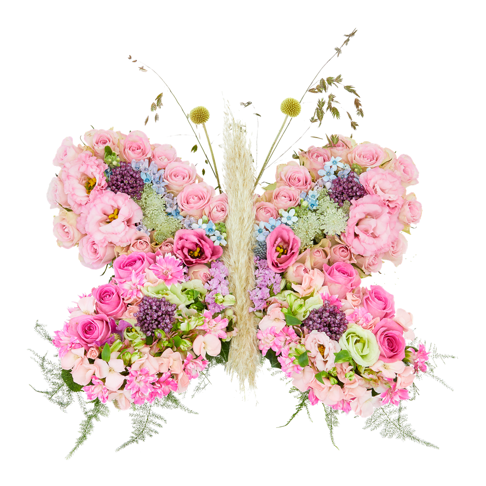 Het rouwstuk Weggevlogen - Bloemstuk in Vlindervorm | Fleurop Het rouwstuk 'Weggevlogen' is een prachtig bloemstuk in de vorm van een vlinder, passend bij het thema 'Onze Sterren' van Fleurop's rouwwerk. Onze sterren verdienen het om gezien te worden en voor eeuwig te stralen. Binnen dit thema vind je betekenisvolle vormen, zoals het bijzondere bloemstuk Weggevlogen, met pastelkleurige bloemen die de vlindervorm accentueren. Weggevlogen is beschikbaar in twee maten: 40 cm (klein) of 70 cm (middel). Bij elke bestelling van rouwbloemen zorgen onze klantenservicemedewerkers voor een persoonlijke handmatige controle, waardoor we garanderen dat het rouwstuk met zorg wordt samengesteld, geheel naar wens. Onze ervaren bloemisten bezorgen de rouwbloemen op elke gewenste locatie, of het nu een kerk, rouwcentrum of crematorium is. Geen noodzaak om het rouwstuk zelf op te halen, want onze bloemisten zorgen ervoor dat het rouwboeket op het juiste moment wordt afgeleverd en de bloemen op hun mooist zijn. Een geruststellende gedachte in moeilijke tijden.