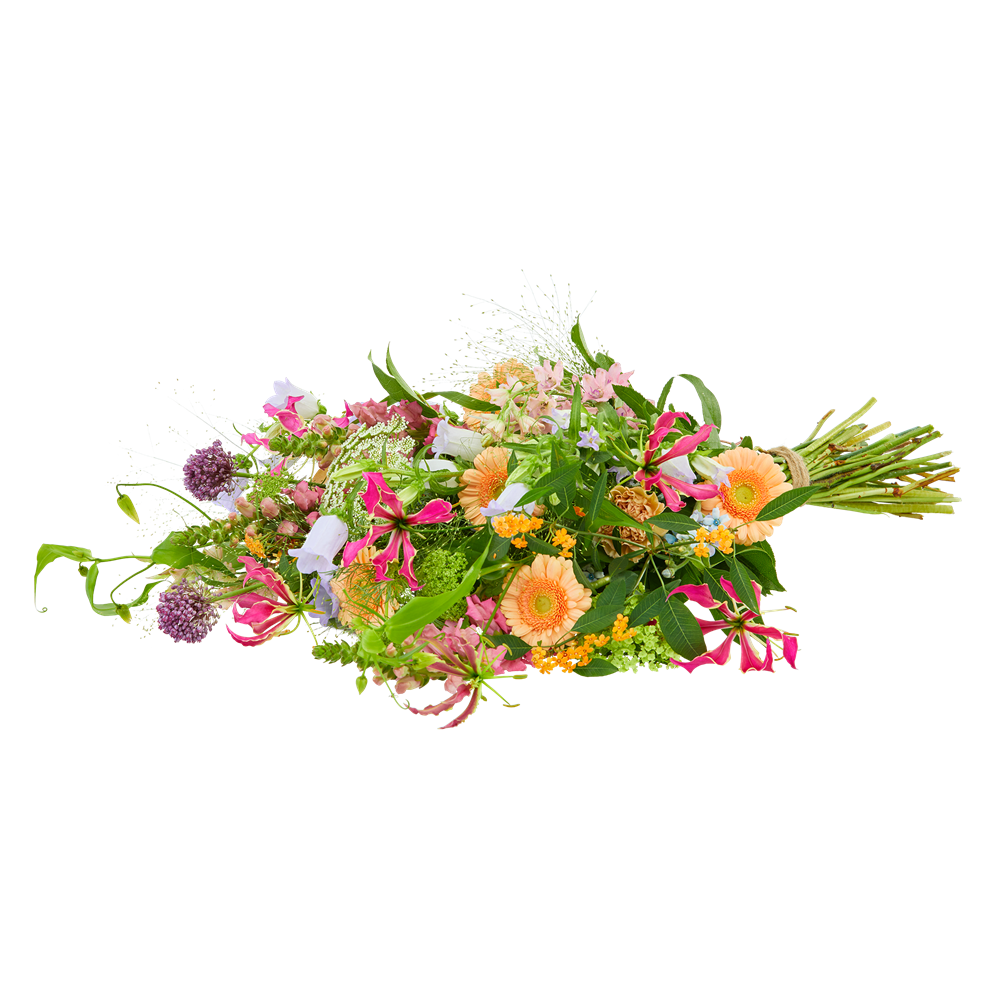 Het Zomertuin rouwboeket: modern, kleurrijk en eigenzinnig | Persoonlijke levering op gewenste locatie Het rouwboeket Zomertuin is een eigentijds en levendig boeket met de prachtigste bloemen. Dit krachtige rouwboeket heeft een unieke uitstraling en wordt geleverd zonder een vaas. Bij elke bestelling van rouwbloemen voeren wij een persoonlijke handmatige controle uit om er zeker van te zijn dat het rouwarrangement volledig aan uw wensen voldoet. De rouwbloemen worden geleverd op een locatie naar keuze, bijvoorbeeld bij een kerk, rouwcentrum of crematorium. U hoeft dus niet zelf naar de bloemist te gaan om het rouwboeket op te halen. De bloemist zorgt ervoor dat het rouwboeket op het juiste moment wordt bezorgd, zodat de bloemen op hun mooist zijn. Dit biedt een geruststellende gedachte in deze moeilijke tijd.