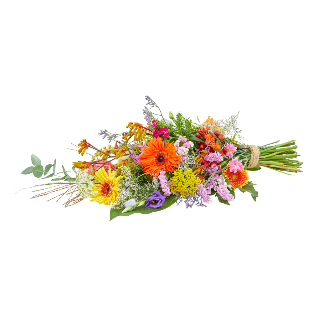 Het kleurrijke rouwboeket Zonnestraal met opvallende en unieke bloemen is perfect voor een liefdevol afscheid. Dit eigenzinnige rouwboeket met krachtige kleuren wordt geleverd zonder vaas. Onze rouwwerken worden persoonlijk en handmatig gecontroleerd, zodat we kunnen garanderen dat het rouwstuk volledig naar wens wordt samengesteld. De rouwbloemen worden bezorgd op een locatie naar keuze, bijvoorbeeld een kerk, rouwcentrum of crematorium. Je hoeft niet zelf naar de bloemist te gaan, wij zorgen ervoor dat het rouwboeket op het juiste moment wordt bezorgd en de bloemen op hun mooist zijn, wat een extra fijne gedachte is in een verdrietige periode.