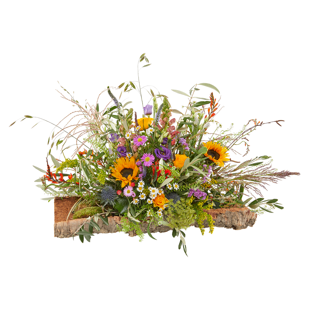 Het kleurrijke bloemstuk 'Zonneweelde' is een eigentijds en natuurlijk meesterwerk.