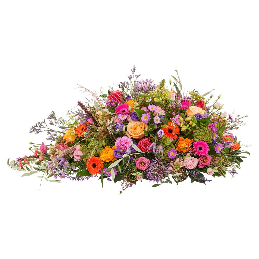 Het rouwstuk Zonsondergang: warm, exotisch en tijdloos | Rouwstuk met bessen, grassen, dahlia’s en hortensia’s | Compact en kleurrijk | Beschikbaar in verschillende maten | Persoonlijke service bij elke bestelling | Bezorging op locatie naar keuze | Bloemen blijven lang houdbaar dankzij vochtige oase.