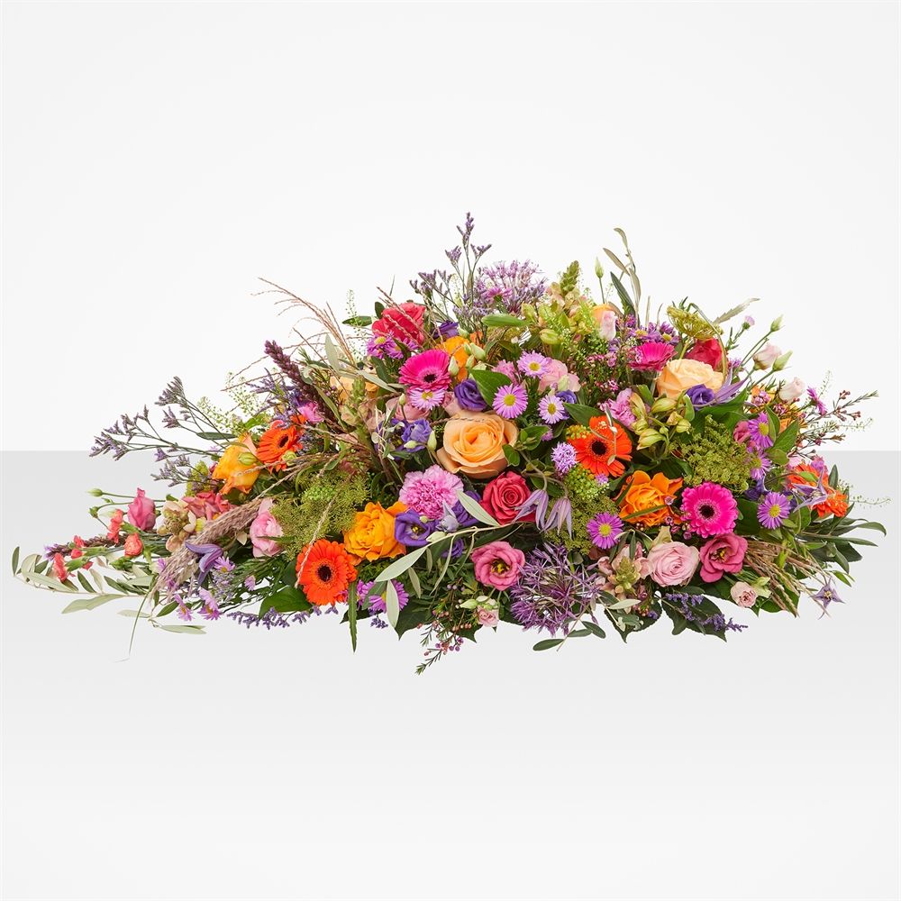 Het elegante rouwstuk "Zonsondergang" straalt warmte en elegantie uit met zijn exotische en tropische uitstraling. Dit unieke stuk is samengesteld met bloemen die het overgangsseizoen van de warme naar koude dagen perfect symboliseren: sierlijke bessen, zachte grassen, weelderige dahlia's en prachtige... Verras jouw dierbaren met dit kunstwerk vol betekenis en schoonheid, en laat ze weten dat je aan ze denkt, zelfs in moeilijke tijden. Laat dit bijzondere rouwstuk door heel Nederland bezorgen en creëer onvergetelijke momenten door de warmte van bloemen te schenken als troostend cadeau.