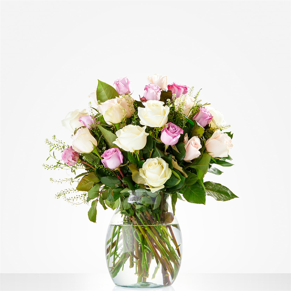 Prachtige zachte rozen in al hun eenvoud, maar daardoor juist bijzonder. De combinatie van deze zachte kleuren zie je niet vaak en maakt het juist zo mooi. Wie ga jij hiermee verrassen? (excl. vaas)